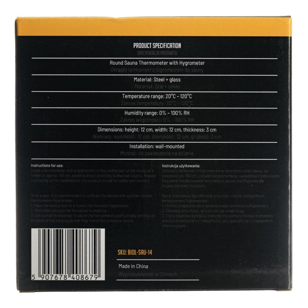 Bilovit ümmargune saunatermomeeter koos hügromeetriga on elegantne abivahend temperatuuri (20-120 °C) ja õhuniiskuse (0-100%) täpseks mõõtmiseks saunas. Vastupidavast terasest ja klaasist, valmistatud, tagab see pikaealisuse ja stiilse välimuse. Selle kompaktsed mõõtmed (12 x 12 x 3 cm) ja lihtne paigaldamine 150 cm kõrgusele muudavad selle ideaalseks täienduseks igale saunale, tagades mugava ja turvalise saunaskäigu.