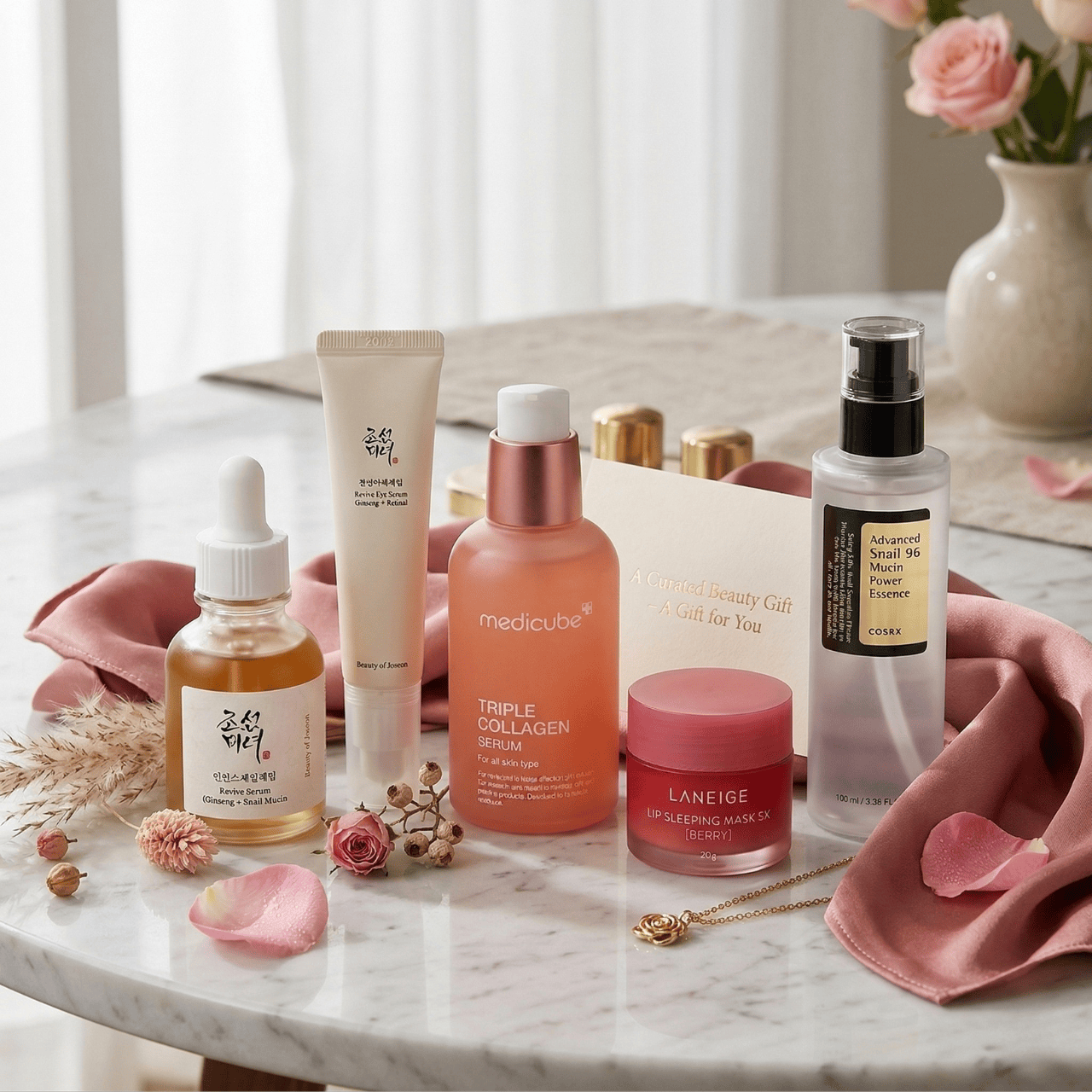 K-Beauty vananemisvastane kinkekomplekt koondab viis tõhusat nahahoolduse põhitoodet, mis sisaldavad teokarva, ženšenni, merekollageeni ja peptiide – mõningaid Korea ilutööstuse kõige tunnustatumaid koostisosi. See hoolikalt koostatud õhtune rituaal on suunatud vananemise nähtavatele märkidele, taastades küpsele nahale elastsuse, sära ja sügava niisutuse.