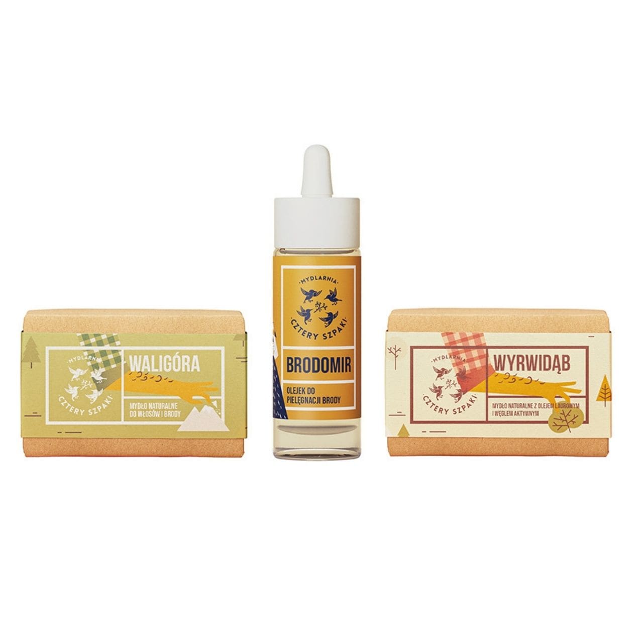 Komplekti filosoofia on lihtsus ja tõhusus ilma kompromissideta . Ei mingeid tarbetuid koostisosi, kunstlikke lõhnaaineid ega värvaineid – ainult puhas, looduslik ja vegan kosmeetika, mis toimib. Brodomir õli pehmendab ja toidab näo karvu, Waligóra seep puhastab habeme, ilma et see kaotaks oma looduslikud õlid, ja Wyrwidąb sütt puhastab sügavalt kogu keha nahka. See on hooldus, mida iga mees hindab.