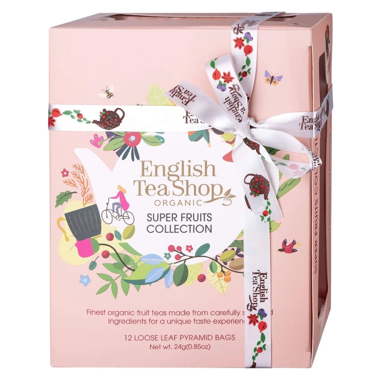 English Tea Shop Super Fruits Collection on komplekt, mis sisaldab 12 püramiidikujulist teekotti, milles on kaks tükki igast kuuest puuvilja- ja ürdi maitsest. Iga segu on loodud pakkuma rohkesti vitamiine ja looduslikke aromeid orgaanilistest puuviljadest, ürtidest ja vürtsidest.