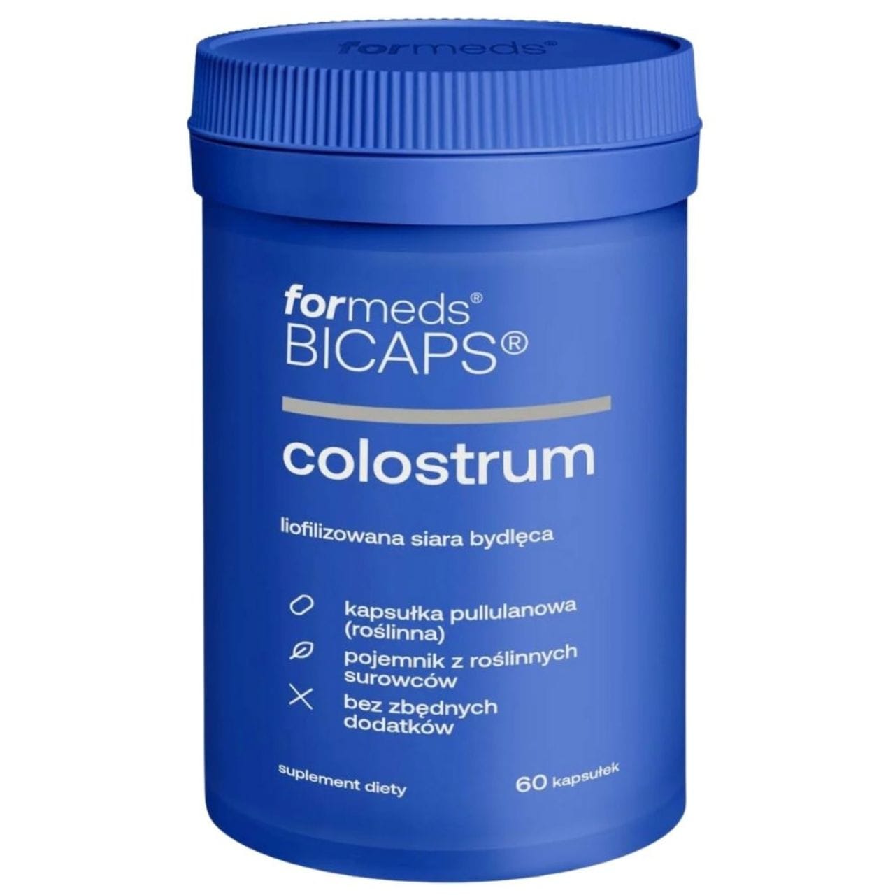 Formeds Bicaps Colostrum on toidulisand kapslite kujul. See on külmkuivatatud veiseliha Colostrum, allikas, mis on saadud esimese 24 tunni jooksul pärast sündi. See tagab toote täieliku stabiilsuse ja bioloogilise aktiivsuse säilimise. Colostrum standardiseeritud immunoglobuliinide (30%), laktoferriini (2,5%) ja polüpeptiidid proliinirikkad (2%).