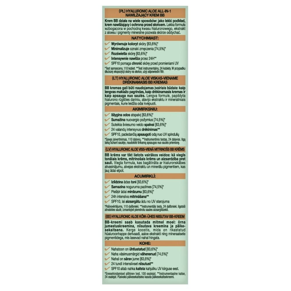 Garnier BB-kreem on multifunktsionaalne toode, mis ühendab endas kerge jumestuskreemi, niisutava kreemi ja päikesekaitse omadused. Selle kerge koostis, on rikastatud hüaluroonhappe derivaadi, aloe vera ekstrakti ja mineraalpigmentidega, võimaldab nahal hingata ja sobib kõikidele nahatüüpidele. BB-kreem ühtlustab koheselt nahatooni, vähendab väsimuse märke, kirgastab jume ja niisutab intensiivselt 24 tundi, pakkudes samal ajal SPF10 kaitset .