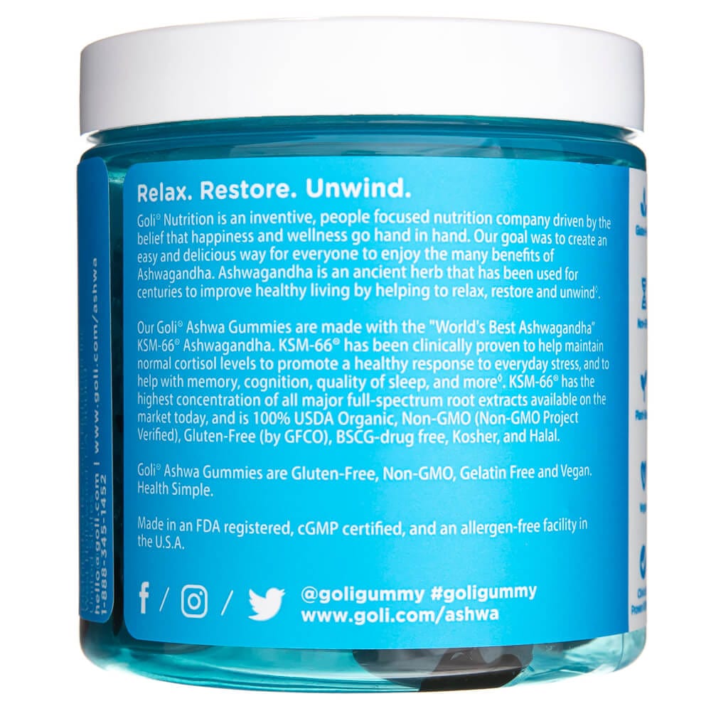 Ashwagandha by Goli Nutrition on toidulisand, mis sisaldab Ashwagandha KSM-66 ® juureekstrakti ja segatud marja maitsega želeekomme. Valem on rikastatud ka D2-vitamiiniga.