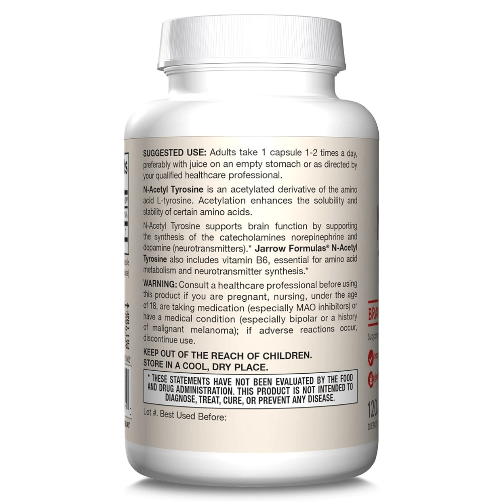 N-atsetüül-türosiin on aminohappe L-türosiini atsetüülitud derivaat. Tavaline L-türosiin on vähem stabiilne ja ka vees vähem lahustuv, mis võib vähendada biosaadavust. Atsetüleerimine suurendab teatavate aminohapete lahustuvust ja stabiilsust. N-atsetüül-türosiin toetab ajufunktsiooni, toetades katehhoolamiinide norepinefriini ja dopamiini (neurotransmitterite)sünteesi. Vitamiin B6 on oluline aminohapete ainevahetuse jaoks.