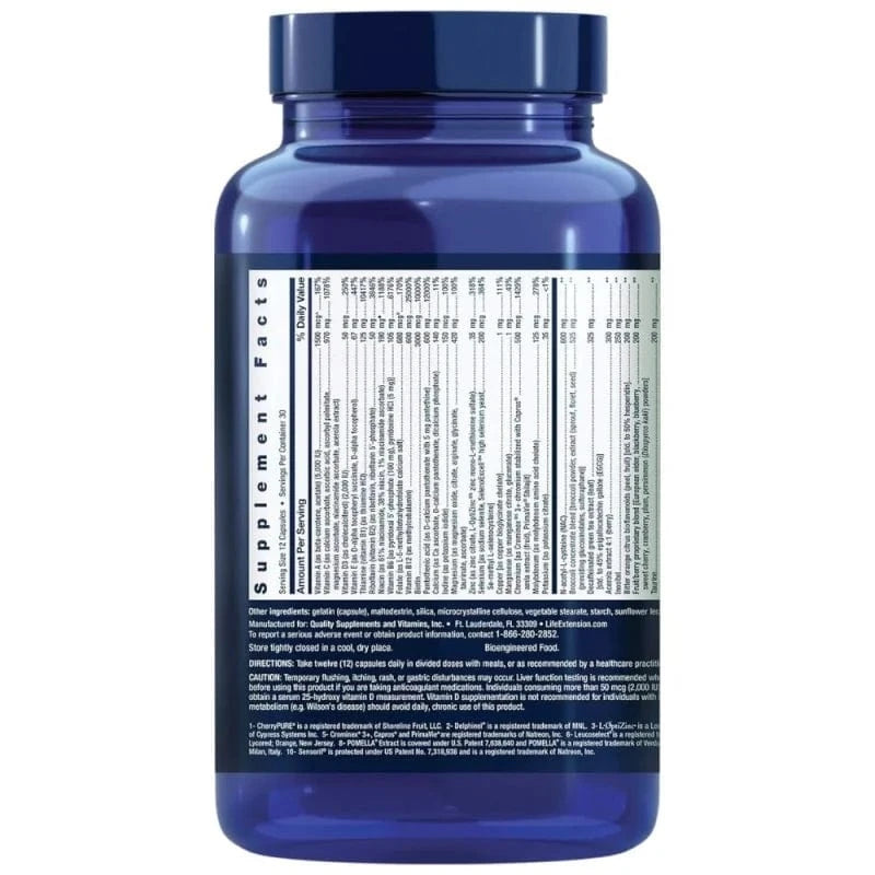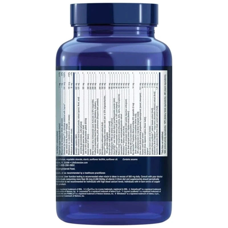 A-vitamiin (beeta-vitamiinina.karoteenina, atsetaat) (5000 IU), C-vitamiin (kaltsiumaskorbaadina, askorbiinhape, askorbüülpalmitaat, askorbüülpalmitaat, magneesiumaskorbaat, niatsinamiid-askorbaat, acerolaekstrakt), D3-vitamiin (kolekaltsiferoolina) (2000 RÜ.), E-vitamiin (D-alfa-tokoferüülsuktsinaat, D-alfa-tokoferool), Tiamiin (vitamiin B1) (tiamiinhüdrokloriidina), Riboflaviin (vitamiin B2) (riboflaviinina, riboflaviin 5'-...fosfaat), vitamiin B6 [püridoksaal-5'-fosfaadina (100 mg), püridoksiin HCI (5 mg) ], folaat (L-5- kaltsiumsoolana (metüültetrahüdrofolaadi), Vitamiin B12 (metüülkobalamiinina), Biotiin, Pantoteenhape (kaltsium-D-pantotenaadi 5 mg pantetiiniga), Kaltsium (kaltsiumaskorbaadina, kaltsium-D-pantotenaat, dikaltsiumfosfaat), jood (kaaliumjodiidina), magneesium (magneesiumoksiidina, tsitraat, arginaat, glütsinaat, tauraat, askorbaat), tsink (tsinktsitraadina, L-OptiZinc ® 3 tsingi mono-L-metioniinsulfaat), Seleen [kui naatriumseleniit, SelenoExcell ® 4 kõrge seleenisisaldusega pärm, Se-metüül-L-selenotsüsteiin], Vask [vasebisglütsinaatkelaadina], Mangaan (mangaantsitraadina, mangaanglükonaadina), Kroom [Crominex ® 5 3+ kroomina, mis on stabiliseeritud Caprosiga ® amla ekstrakt (puuviljad), PrimaVie ® Shilajit], Molübdeen (molübdeen aminohappe kelaadina), Kaalium (kaaliumtsitraadina), Brokkoli kontsentraadi segu [brokkoli pulber, ekstrakt (idud, õisikud, seemned) (glükosinolaatide, sulforafaani) ], N- -atsetüül-L-tsüsteiin (NAC), Kofeiinivaba rohelise tee ekstrakt (lehed) [std. kuni 45% epigallokatekiingallaat (EGCG) ], Acerola ekstrakt 4:1 (marjad), Inositool, Tsitrusviljade bioflavonoidid mõru apelsinist (koor, puuviljad) [std. kuni 50% hesperidiini], Oman puuvilja- ja marjasegu [põldmari, murakas, mustikas, kirss, jõhvikas, ploomi, persimmon (Diospyros kaki) pulber], Tauriin, Metsmustika antotsüaaniekstrakt (puuviljad), Sensoril ® 10 Ashwagandha ekstrakt (juur, lehed) [std. kuni 32% oligosahhariidid,10% glükosiidkonjugaadid], Silymarin [piimanõgese ekstraktist (seemnetest) ], Trimetüülglütsiin (TMG) (veevaba betaiinina), CherryPure ® 1 proantotsüanidiiniekstrakt (koor), POMELLA ® 8 Granaatõuna ekstrakt (viljad) [std. kuni 30% punikalagiinid], Looduslikud segatud tokoferoolid (pakkudes gamma, delta, alfa, beeta tokoferoole), MirtoSelect ® 9 mustikaekstrakt (puuviljad), Leucoselect ® 6 viinamarjaseemne proantotsüanidiiniekstrakt, Bio-Kvertsetiin ® Proprietary Blend, mis pakub 35% kvertsetiini (5 mg) [Jaapani sophora kontsentraadist (õiepungast) ],30% galaktomannaanid (4 mg) [lambaläätse seemnetest (seemnest) ] 15 mg, Bromelaiin [ananassist (tüvest) ] (2400 želatiini seedimise ühikut/gramm), Luteiin [astelpaju ekstraktist (õiest) ] (pakkudes 465 mcg trans-zeaksantiin), Oliiviekstrakt (viljadest) (pakkudes polüfenoole, hüdroksütürosool, türosool, oleuropeiin), Seesamiseemne lignaaniekstrakt, Luteoliin [Jaapani sofora (õienuppudest) ], Apigeniin, Boron (bori aminohappekelaadina), Lükopeen [LycoBeads ® 7 looduslikust tomati ekstraktist (viljadest) ], Delfinidiin [Delphinol ® 2 ekstraktist maqui marjadest (Aristotelia chilensis) (viljadest) ], Tsüanidiin 3-glükosiid (C3G) [mustsõstra ekstraktist (puuviljadest) ], Želatiin (kapsel), Täidised: maltodekstriin, ränidioksiid, mikrokristalliline tselluloos, taimne stearaat, tärklis, päevalille letsitiin, päevalilleõli.