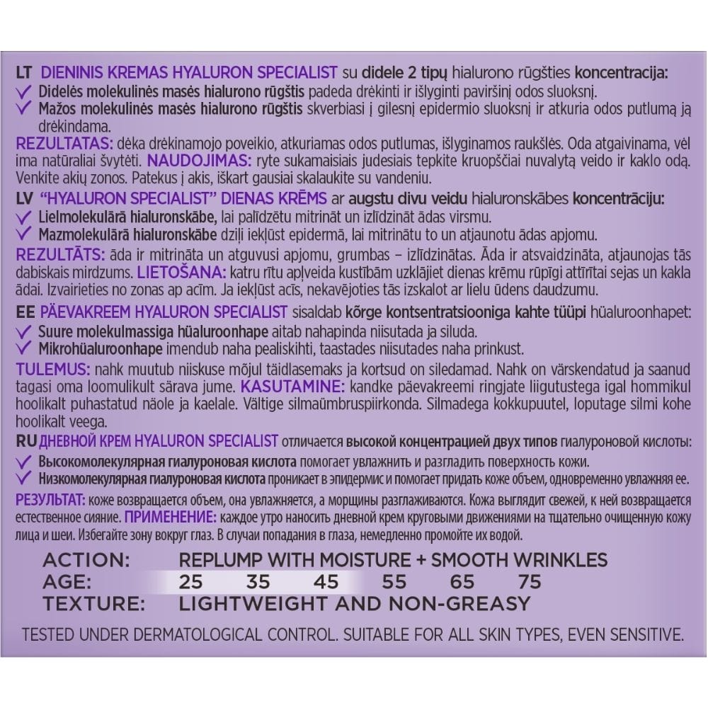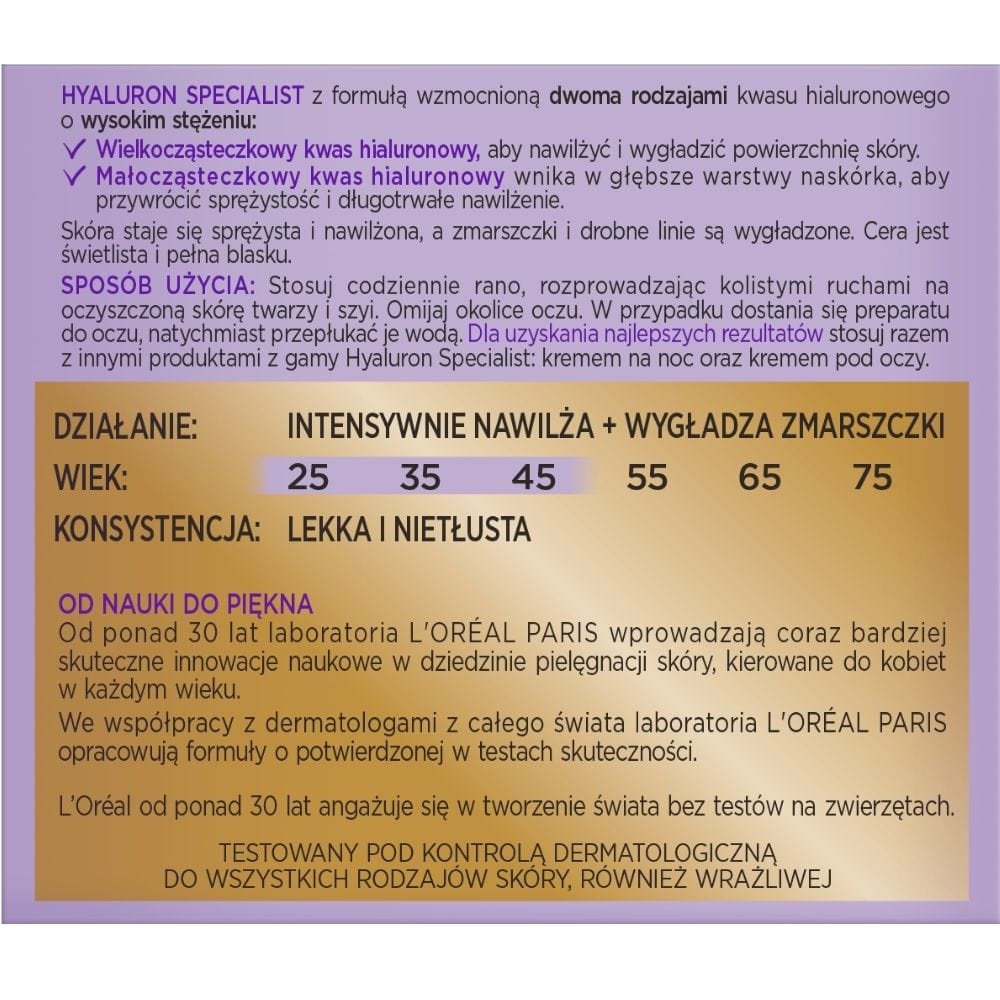 Hyaluron Specialist niisutav päevakreem on L'Oréal Paris Laboratories'i poolt välja töötatud uuenduslik toode taastava niisutava hoolduse osana. See vastab nende naiste vajadustele, kes soovivad hoida oma naha nooruslikuna ja värskena, võitleb tõhusalt esimeste vananemismärkide vastu ja pakub kaitset kahjulike päikesekiirte eest.