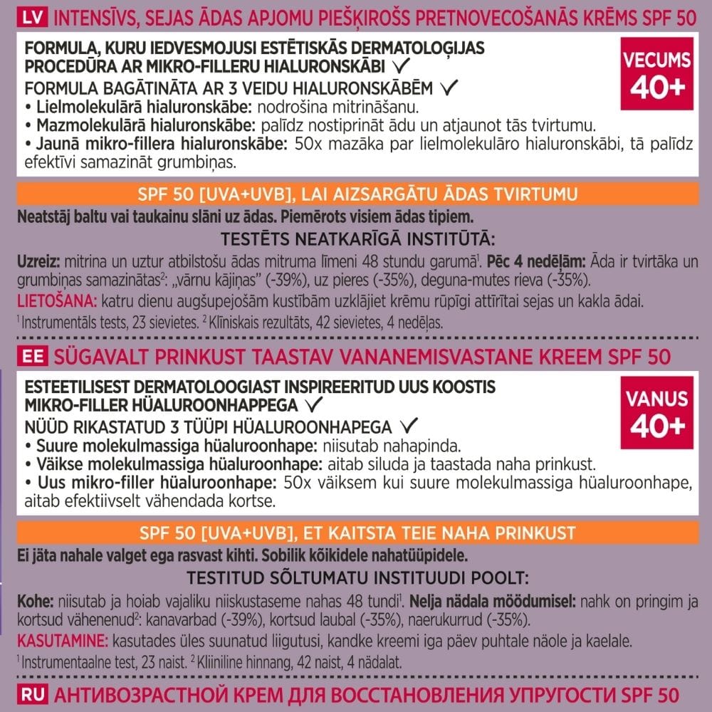 L'Oréal Paris Revitalift Filler Day Cream SPF 50 on uuenduslik toode, mis on loodud vastuseks vananeva naha keerulistele vajadustele. L'Oréal Paris Laboratories, inspireerituna esteetilisest Derma toloogiast, on välja töötanud koostis, mis mitte ainult ei võitle tõhusalt vananemise nähtavate märkide, vastu, vaid ennetab ka fotovananemisega seotud tulevasi muutusi.
