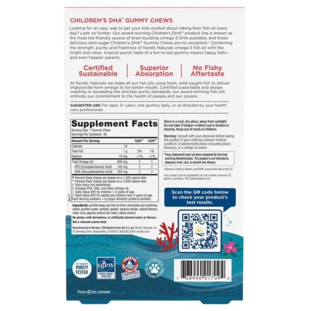 Nordic Naturals Laste DHA on toidulisand maitsvate troopiliste puuviljade maitsega kummidena. Spetsiaalselt välja töötatud lastele alates 3. eluaastast. Sisaldab Omega-3 rasvhappeid (DHA + EPA) ilma lisatud suhkruta. Toode sisaldab 600 mg omega-3 rasvhappeid ühe portsjoni kohta.