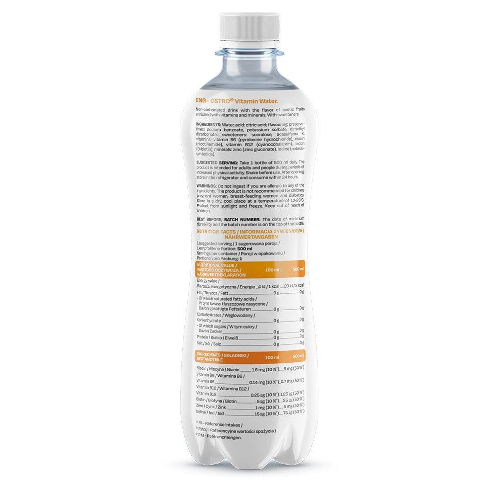 Ostrovit OSTRO ® Vitamiinivesi on madala energiasisaldusega gaseerimata jook, mis annab organismile väärtuslikke vitamiine ja mineraalaineid. See on eksootilise puuvilja maitsega toode, millele ei ole lisatud suhkrut, ja mis on loodud sportlastele ja inimestele, kellel on suurenenud vajadus väärtuslike mikrotoitainete järele.